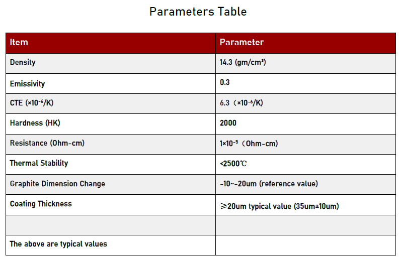 Tantaalkarbiid on suure jõudlusega materjal, millel on äärmiselt kõrge sulamistemperatuur (ligikaudu 3880 ℃), suurepärane soojusjuhtivus, suurepärane keemiline stabiilsus ja suurepärane mehaaniline tugevus. Konkreetsed jõudlusparameetrid on järgmised: